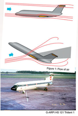 How the airflow over the tail of a Trident Aircraft gets disturbed by the wing, at high nose-up attitude and develops into an unrecoverable Deep Stall. The Blue arrow is the relative flow of the air. (See figure 1)