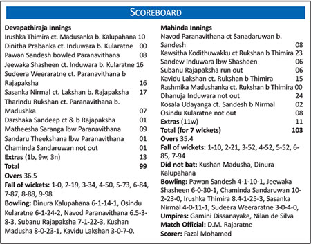 After posting a below par total of 99 runs, Devapathiraja fought back when Irushka Thimira rattled three quick wickets to trouble Mahinda. They were just two wickets down for 50 at one stage but a run out in the 13 over and back to back wickets by Thimira in the next gave Devapathiraja respite.