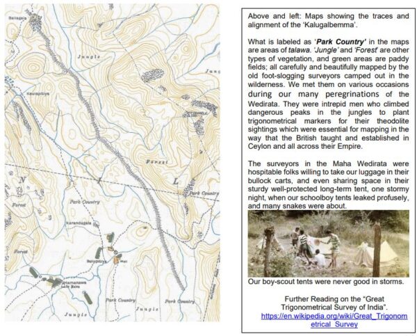 The timeless oral traditions of the villagers’ claim the Kalugalbemma to be the remnants of a great highway that ran from the Raja Rata in the north to the Kingdom of the Ruhuna in the south. This feature appears on several of the old 1”:1mile topo sheets of the Survey Department which were compiled in an era when hardworking surveyors traversed the country on foot and recorded each and every geographical feature on the ground. But this Kalugalbemma feature lies hidden under the tall mana grass of the talawa. Modern aerial and satellite mapping simply do not pick it up or show it.