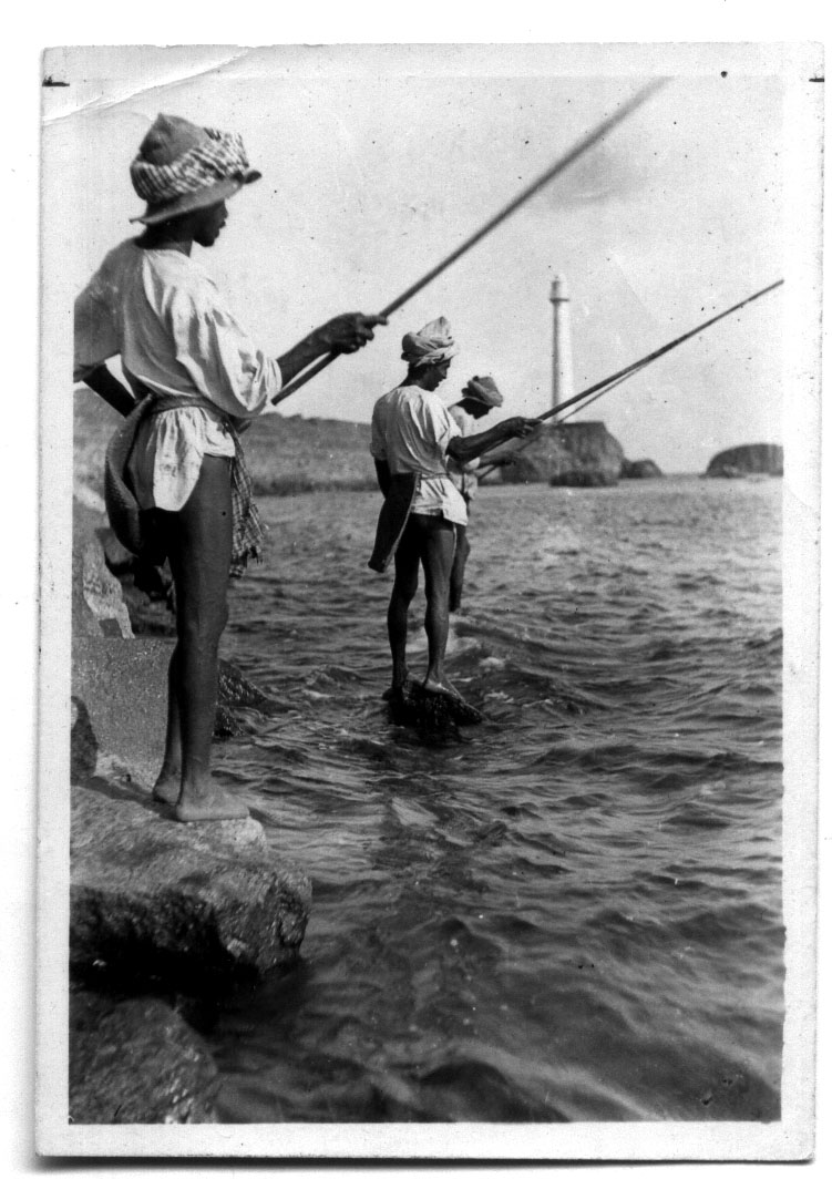 Fishermen at it in the 1930s along the rocks at the foot of the ramparts, western side … a common sight even in the 1950s but now unlikely in the same style of garments —Pics by Lincoln Pereira
