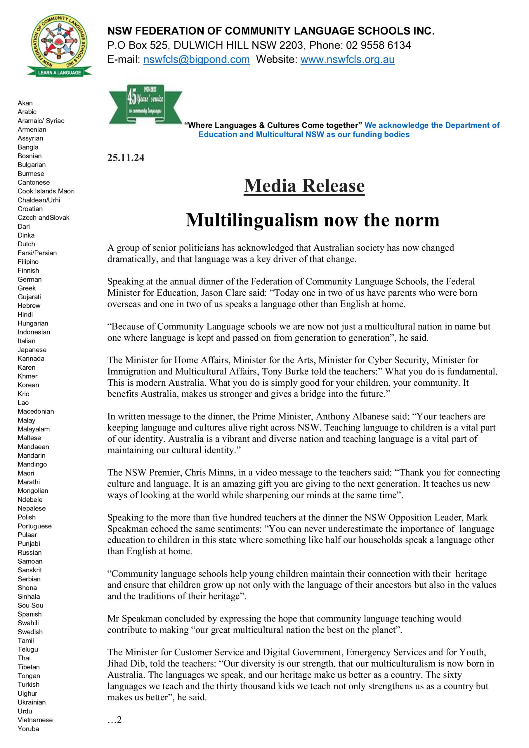 The President of the Federation of Community Language Schools, Lucia Johns told the gathering: “Community language schools are not just places where students learn a language; they are a place for cultural exchange, where the heritage of various communities is preserved and passed on to future generations. Our schools provide students with the opportunity to connect with their roots, to celebrate their traditions, and to embrace the diverse tapestry that makes Australia unique”. “The teachers at these community language schools play a central role in this process. Hundreds of teachers, often volunteers, dedicate their time, energy, and expertise to help students learn and grow in both language proficiency and cultural understanding. These educators are not just teaching grammar and vocabulary, they are fostering a sense of pride in students’ cultural identities and empowering them to bridge the gap between their heritage and the broader Australian society”, she said The NSW Federation of Community Language Schools was established in Sydney in 1978 as a not-for-profit reorganization. The aim of the Federation is to unite all community language schools and work together to sustain community languages and contribute to the multicultural assets of New South Wales. It represents around 250 member schools in 460 locations with approximately 30,000 students who can choose to learn one or more from the 75 different languages available. Media Inquiries: Warren Duncan 0411 507080 or Email: warren.duncan.crc@gmail.com |