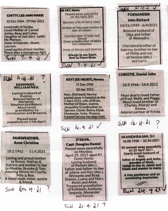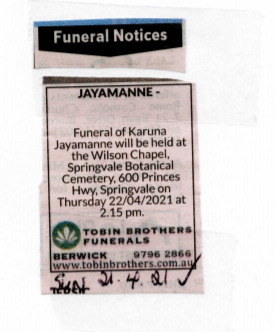 Articles Obituary notices – April 2021 Last updated: May 2, 2021 5:53 pm By eLanka adminByeLanka admin Share 0 Min Read SHARE Obituary notices – April 2021 TAGGED:Obituary notices – April 2021 Share This Article Email Copy Link Print Previous Article eLanka Newsletter –02 May 2021 – 1st edition – Sri Lankans in Australia Next Article Human Elephant Conflict-Sri Lanka – by Oscar E V Fernando FacebookLikeYoutubeSubscribeLinkedInFollow Most Read “A PICTURE SPEAKS A 1000 WORDS” – By Des Kelly A Life Hack for when we’re Burnt Out & Broken Down – By Uma Panch Narration of the History of our Proud Ancestral (Orang Jawa) Heritage. by Noor R. Rahim eLanka Marriage Proposals Noel News Noel News- By Noel Whittaker EILEEN MARY SIBELLE DE SILVA (nee DISSANAYAKE) – 29 September 1922 – 6 April 2018 – A Woman of Value an Appreciation written by Mohini Gunasekera K.K.S. Cement Factory Dr.Harold Gunatillake’s 90th Birthday party Cricket: Sri Lanka’s women’s squad in Melbourne - Advertisement -