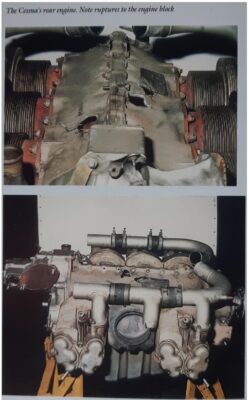 In the meantime the Captain had managed to bring the Cessna over Batticaloa airfield at 5200 feet. He then lowered the landing gear and got it visually checked by the Y-12 Pilot. The undercarriage lever returned to neutral after lowering but the green light did not turn on. He neither recycled the gear nor tried to change the warning light bulb as the aircraft could not maintain height. He descended through spiral approach and landed safely at approximately 1255 hours. On inspection it was found that the rear engine had suffered a catastrophic failure, and even the cylinder block had been ruptured (see photographs below).