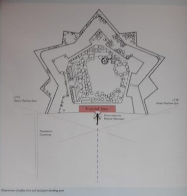 The next problem was where the helicopter would land. After a good deal of discussion, an officer walked up to the board and with the aid of a sketch map of the Fort showed how a safe landing spot was created by the structure of the Fort and the positioning of the LTTE’s guns. The LTTE’s heavy machine guns could not bring direct fire to bear upon this area, and therefore the helicopter would be reasonably safe while it was on the ground (which was also the time it was most vulnerable).