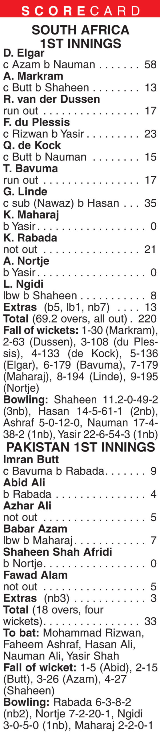 Elgar and Faf du Plessis (23) had steadied the innings during their 45-run stand for the third wicket after Aiden Markram (13) and Rassie van der Dussen (17) were dismissed in the first session. Both Pakistan and South Africa entered the Test with two spinners and three pace bowlers.