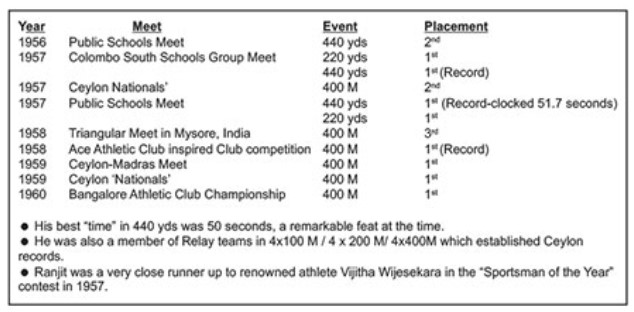 The triumphs of Wijeyesekere in the 50’s and 60’s were legion. I succeeded in obtaining a few of his achievements from various sources, despite the passage of over 50 years from the time he blazed the track. The following table captures some of his outstanding performances: