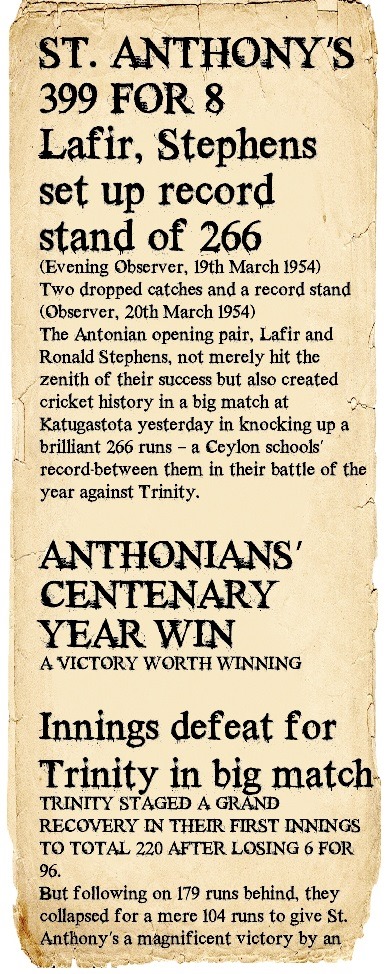 Famous Antonian Cricketer – A.C.M.Lafir and Ronnie Stevens put up a 266-run partnership for the first wicket establishing a new schools record in 1954 at the Trinity-Antonian big match
