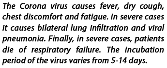 A: Covid-19 is the newest form of virus of the group of viruses called ‘Corona virus’. As I mentioned earlier, NO remedy or vaccine has been so far invented for this deadly disease as it is new to the world. This disease is extremely contagious as the transmissibility of the virus is extremely rapid. To date, there is no proven effective treatment for Covid -19. Experts in different countries try anti-malarial drugs, immune-modulatory drugs, antiviral drugs, and the drugs used for autoimmune diseases. Considering the nature of the virus, it is said that the virus is destroyed in temperatures above 79 Celsius (175 Fo). This virus causes fever, dry cough, chest discomfort and fatigue. In severe cases it causes bilateral lung infiltration and viral pneumonia. Finally, in severe cases, patients die of respiratory failure. The incubation period of the virus vary from 5-14 days.