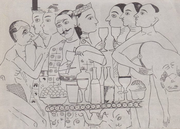 Artwork depicting Sri Lankans of long ago enjoying arrack after a battle. Image courtesy: