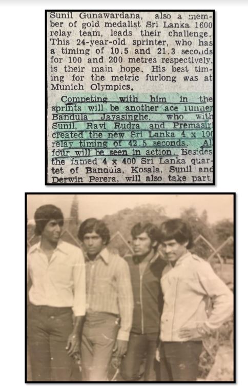 September 1974: I was truly delighted that our Sri Lankan 4×400 quartet of W. Wimaladasa, Sunil Gunawardena, Kosala Sahabandu and A. Premachandra not only won Gold but set a New Asian Games Record in doing so. My teammate and good friend Bandula Jayasinghe