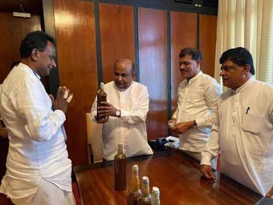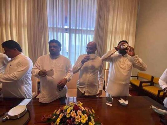 The syrup produced by Ayurvedic practitioner Dhammika Bandara, which he claims is a cure for COVID-19, was handed over to Speaker Mahinda Yapa Abeywardene today at the Parliamentary complex. The Speaker and several other government MPs were later seen taking a sip of the syrup.