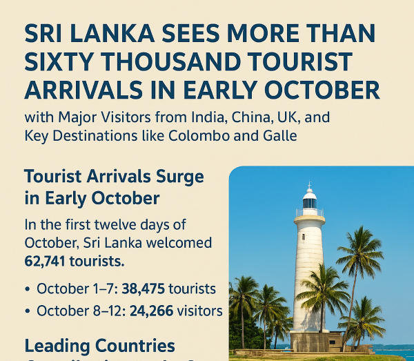 Sri Lanka Sees More than Sixty Thousand Tourist Arrivals in Early October, with Major Visitors from India, China, UK, and Key Destinations like Colombo and Galle –