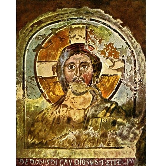 Jesus is sometimes shown with a cruciform halo, as in this early Christian fresco in the Ponzianus catacomb, Rome (Credit: Alamy)