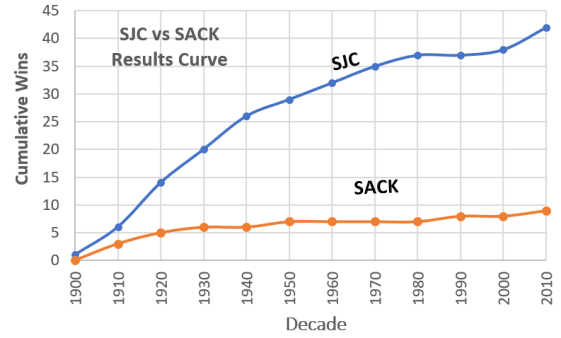 The Curve on Cumulative Wins illustrates the Josephian dominance from 1910 to 1970 decades