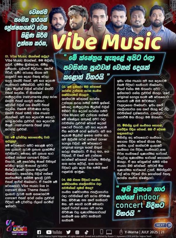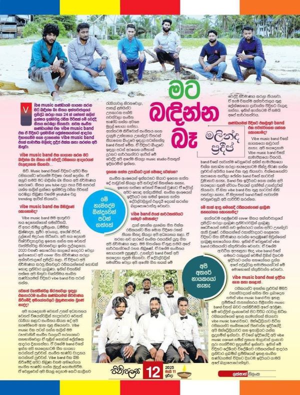 ‘Vibe Music’ group   do not attempt to emulate anyone .The song  ‘Mata Badinna Behe’ had became very  popular.There have been times when their weaknesses were pointed out which they remedy. They  receive assistance and support from senior artistes. They make sure to make different songs in many genres. The “Vibe Music’ band only performs predominantly  in indoors only. The group consists of the leader Malinda Pradeep who is totally blind from birth , Thimira Pramilanka,Dhammika Krishnadasa,Ayesh Pieris, Sameera Arangala and Dulshan Maduranga while Gimhana Gamage is the music composer The main significance of the group is that all could sing as well could play many musical instruments well.,The six in the group had been together for a long time. Currently we are invited to concerts in Sri Lanka while a number of invitations have been received for overseas concerts in Australia, England,USA ,Europe ,Italy etc. The concerts in Melbourne Australia is fixed for end of August with all arrangements confirmed organized by Aus Lanka
