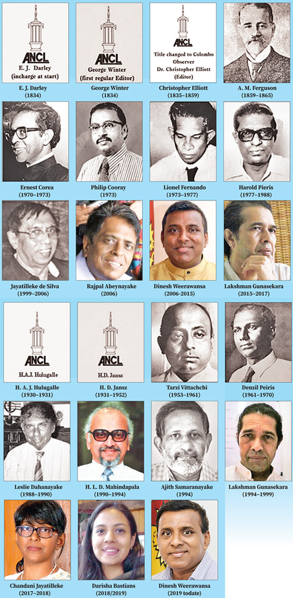 The Sunday Observer over the years, has produced illustrious journalists. Though the list would be long to spell out, among the distinguished journalists the Sunday Observer produced include the Sri Lankan Editors: H. A. J. Hulugalle (1930-1931), H. D. Jansz (1931-1952), Tarzie Vittachchi (1953-1961), Denzil Peiris (1961-1970), Ernest Corea (1970-1973), Lionel Fernando (1973-1977), Harold Peiris (1977-1988), Leslie Dahanayake (1988-1990), H. L. D. Mahindapala (1990-1994), Ajith Samaranayake (1994), Jayatilleke de Silva (1999), Lakshman Gunasekara (2000-2004), Rajpal Abeynayake (2006), Dinesh Weerawansa (2006-2015), Chandani Jayatilleke (2017), Dharisha Bastians (2018 – 2019) and Dinesh Weerawansa who is back on board as the Editor-in-Chief of Sunday Observer.