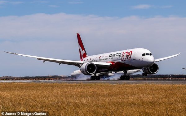 The Qantas Boeing 787 Dreamliner lands at Sydney Airport today after a 19-and-a-half hour non-stop flight from London