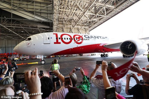 The plane was met by more than 1,000 Qantas employees to mark the carrier’s 99th birthday and kick off 12 months of celebrations as it heads towards its centenary