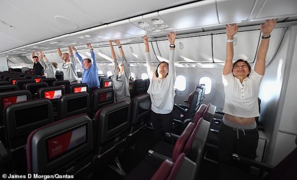Passengers on board the ultra-long-haul flight take part in a series of stretching exercises