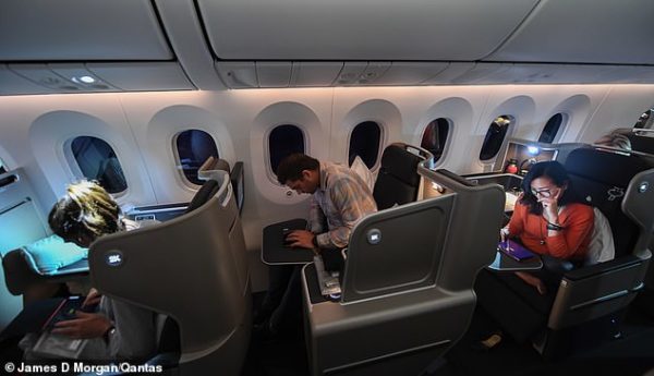 On board: Passengers on their seats aboard Qantas flight QF7879, flying direct from London to Sydney