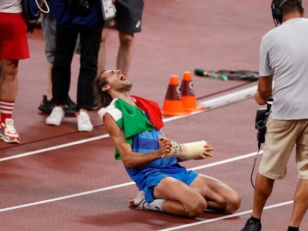 It meant both athletes walked away with gold, sparking wild scenes especially from Tamberi, who collapsed to the ground in tears and celebrated with Lamont Marcell Jacobs after his fellow Italian won the men’s 100m final.