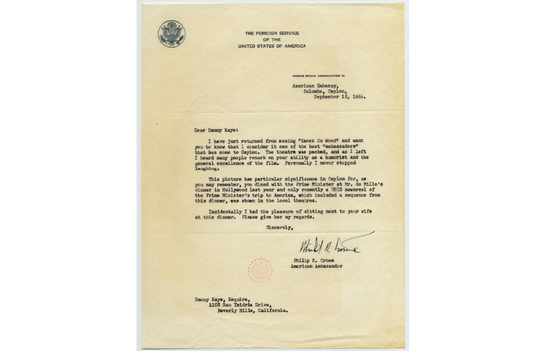 The US Ambassador in Ceylon Philip K.Crow wrote to Danny Kaye referring to his meeting with Sir John Kotelawala.