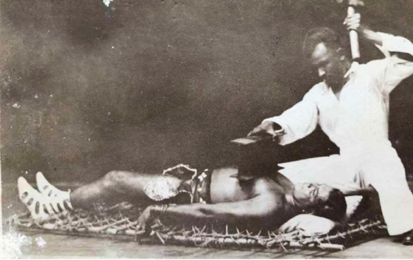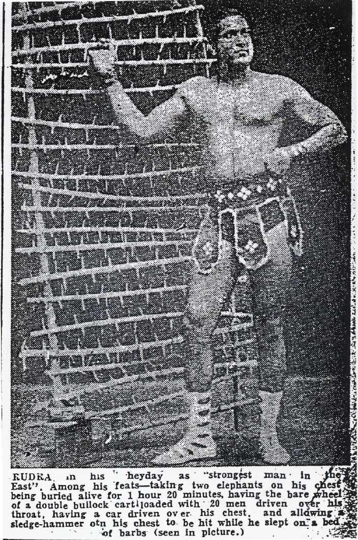 ‘A specialty of Mr. Rudra was to lie on a bed of nails with a rock about half a ton in weight placed on his chest. Once an inch thick rod of mild steel was cut on an iron slab placed on his chest while he lay in that posture.’ – Sunday Times of Ceylon 11th October 1953